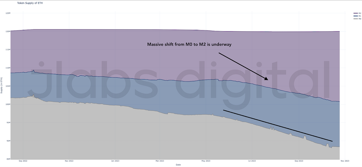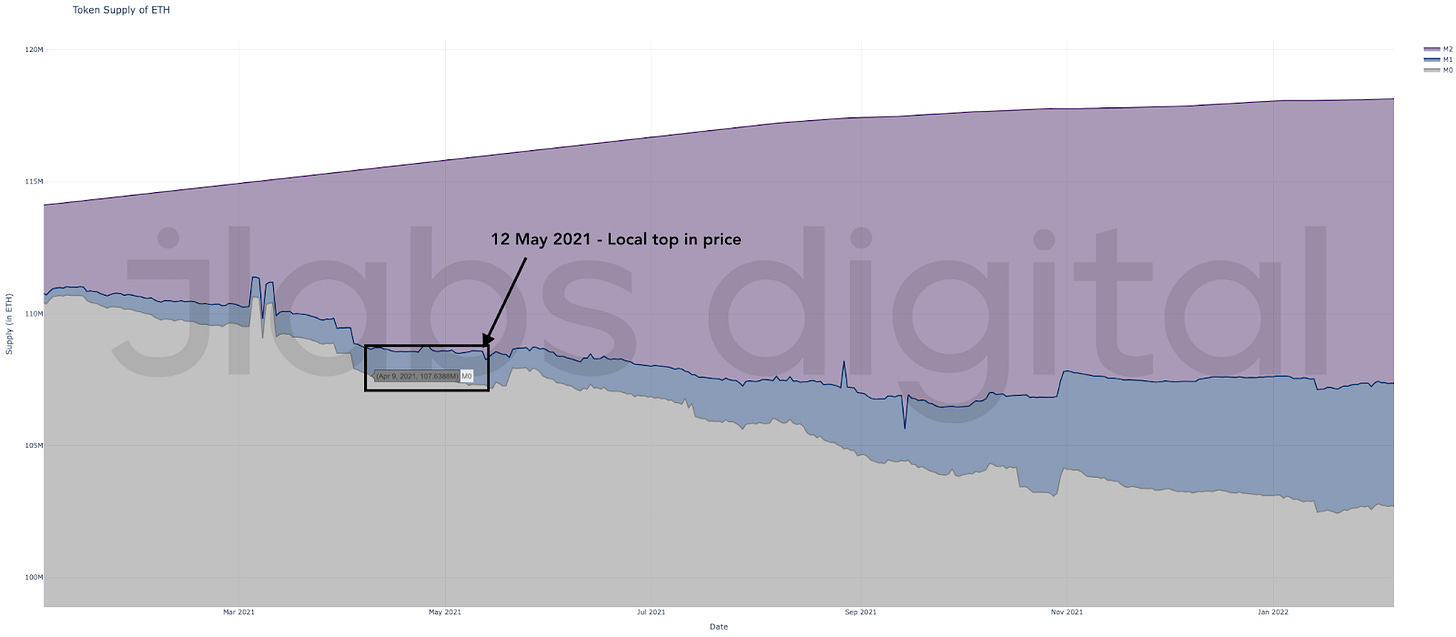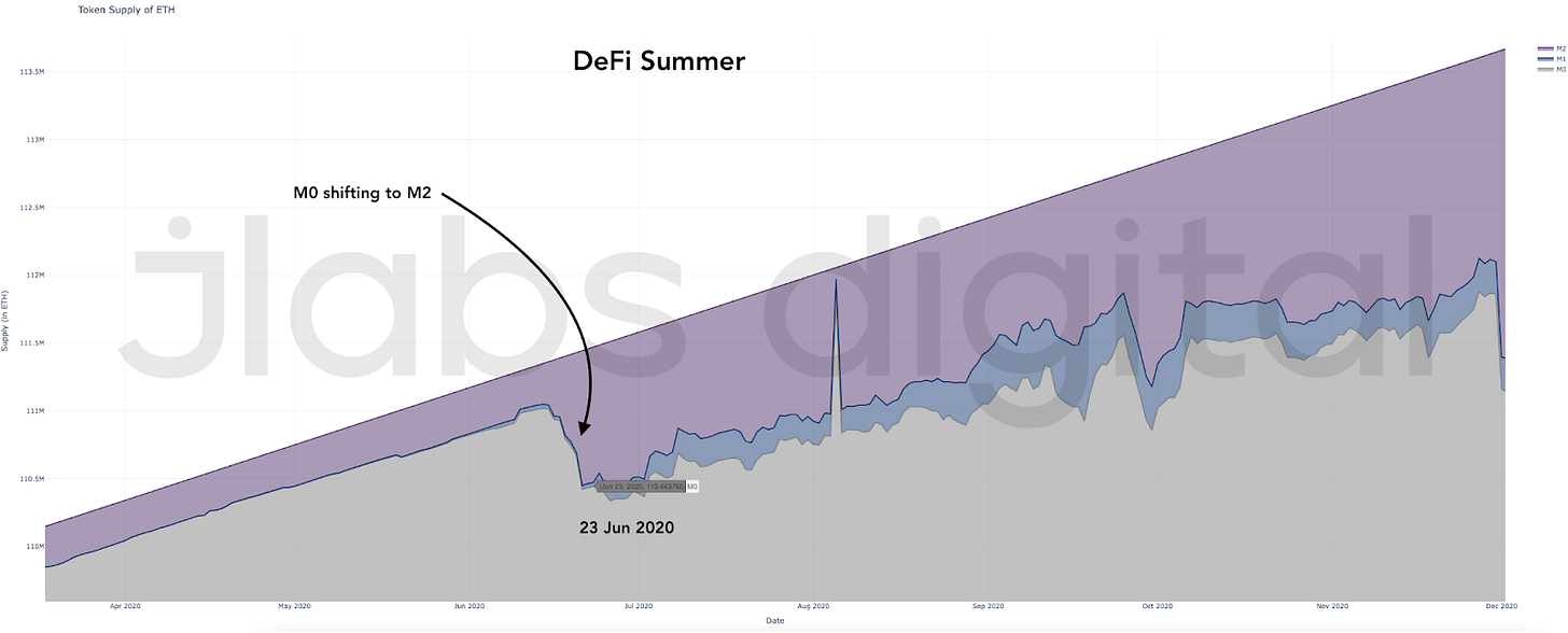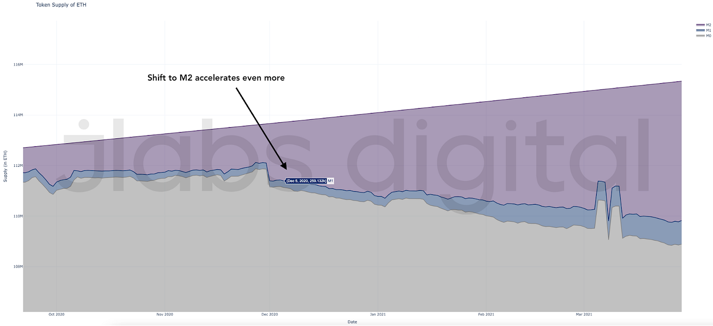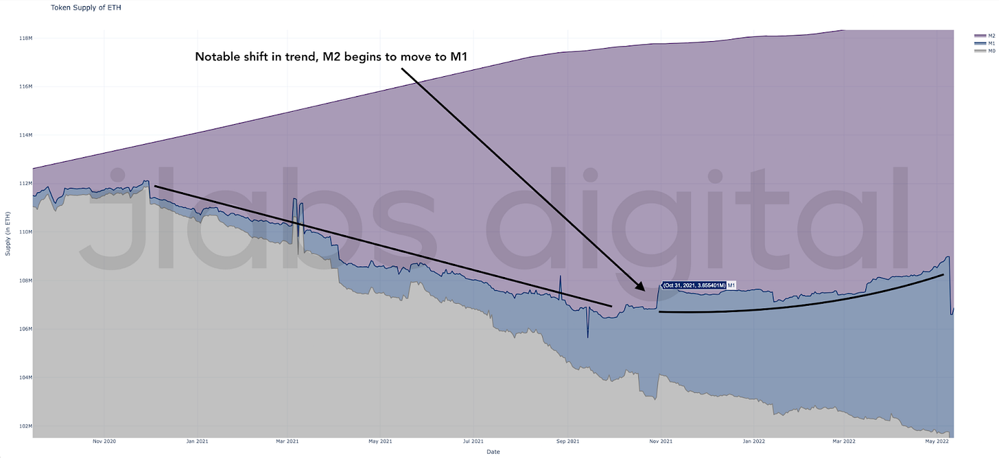 This time around, M1 (inclusive of M0) is now declining. Another first for ETH supply. More and more ETH went toward M2 usage.