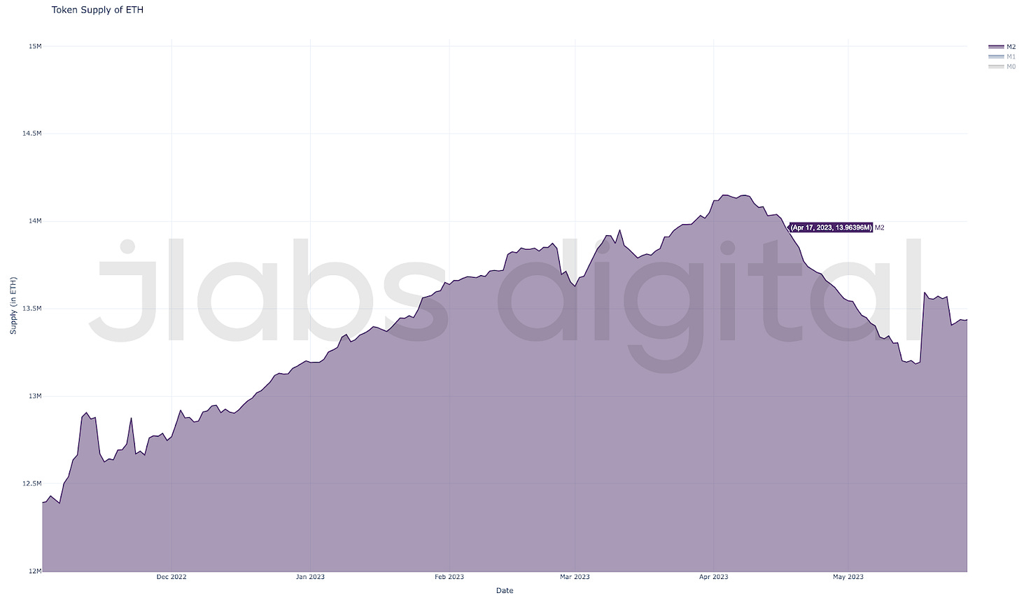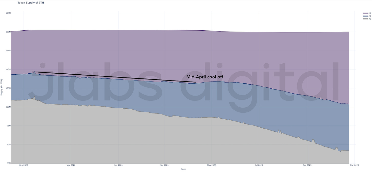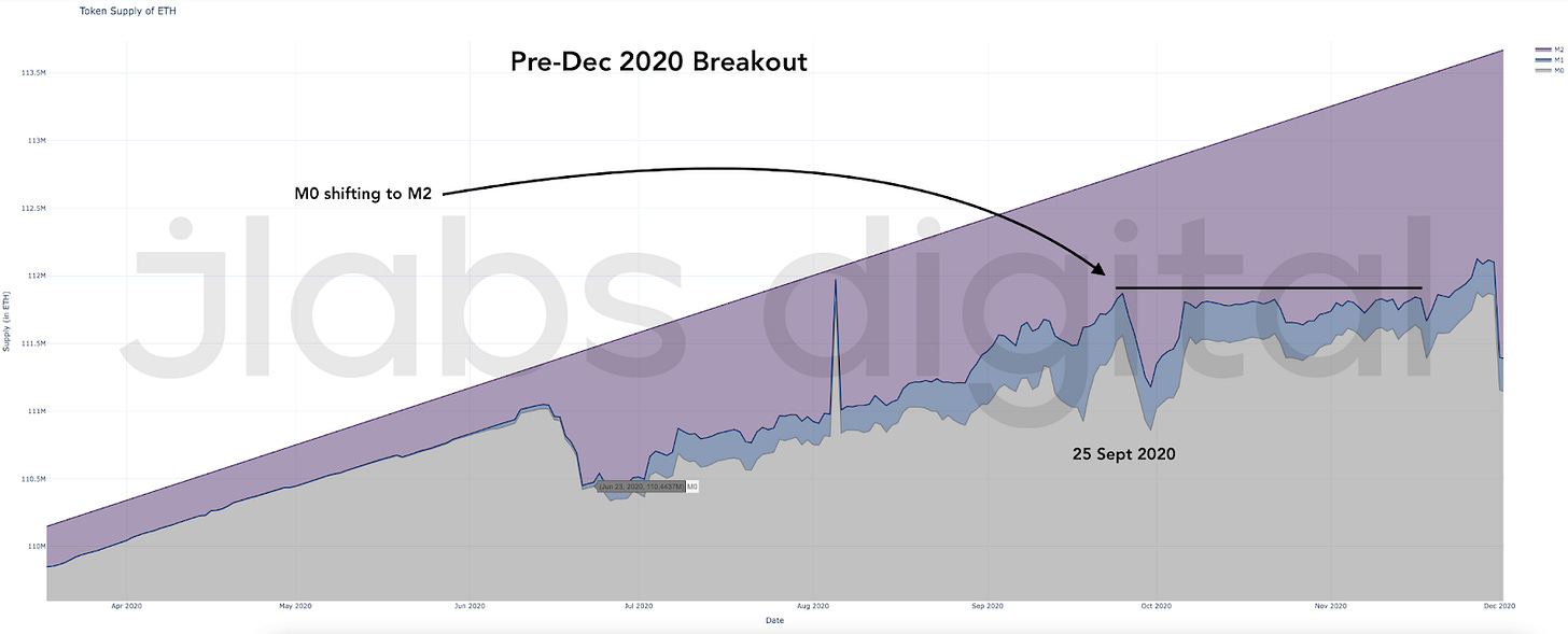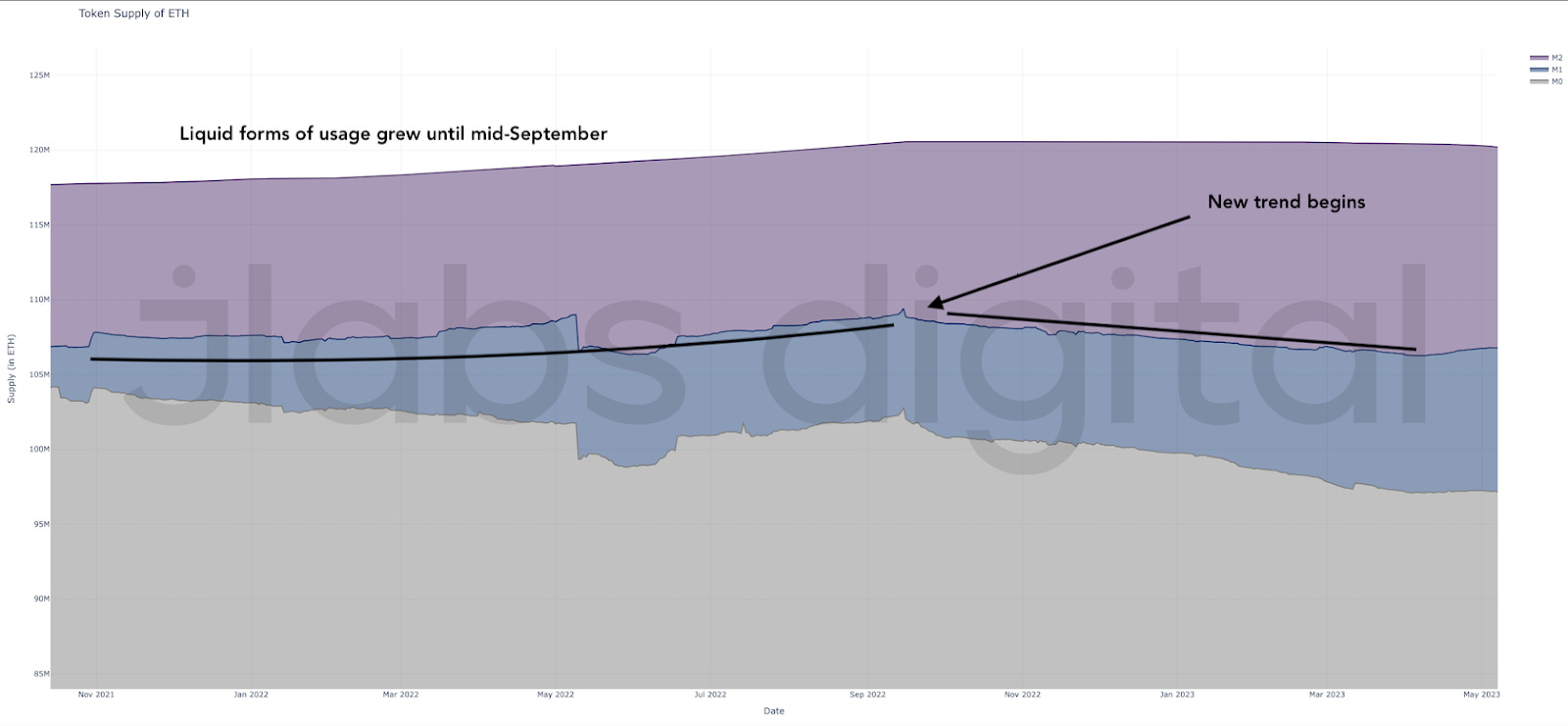 This time around, M1 (inclusive of M0) is now declining. Another first for ETH supply. More and more ETH went toward M2 usage.