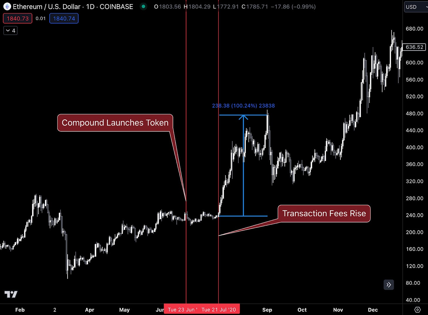 For Compound, the launch of COMP incentivized users to lock up their ETH as collateral. It was a major shift in use case for ETH that rippled out to other protocols.