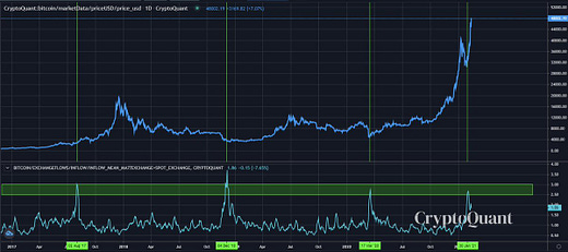 If we were to look at wallet balances above 1k it’s not a strong of an indicator since these wallets tend to sell way before a top. This 100-1k BTC range has worked best to day, and the current spike is a sign of accumulation.
